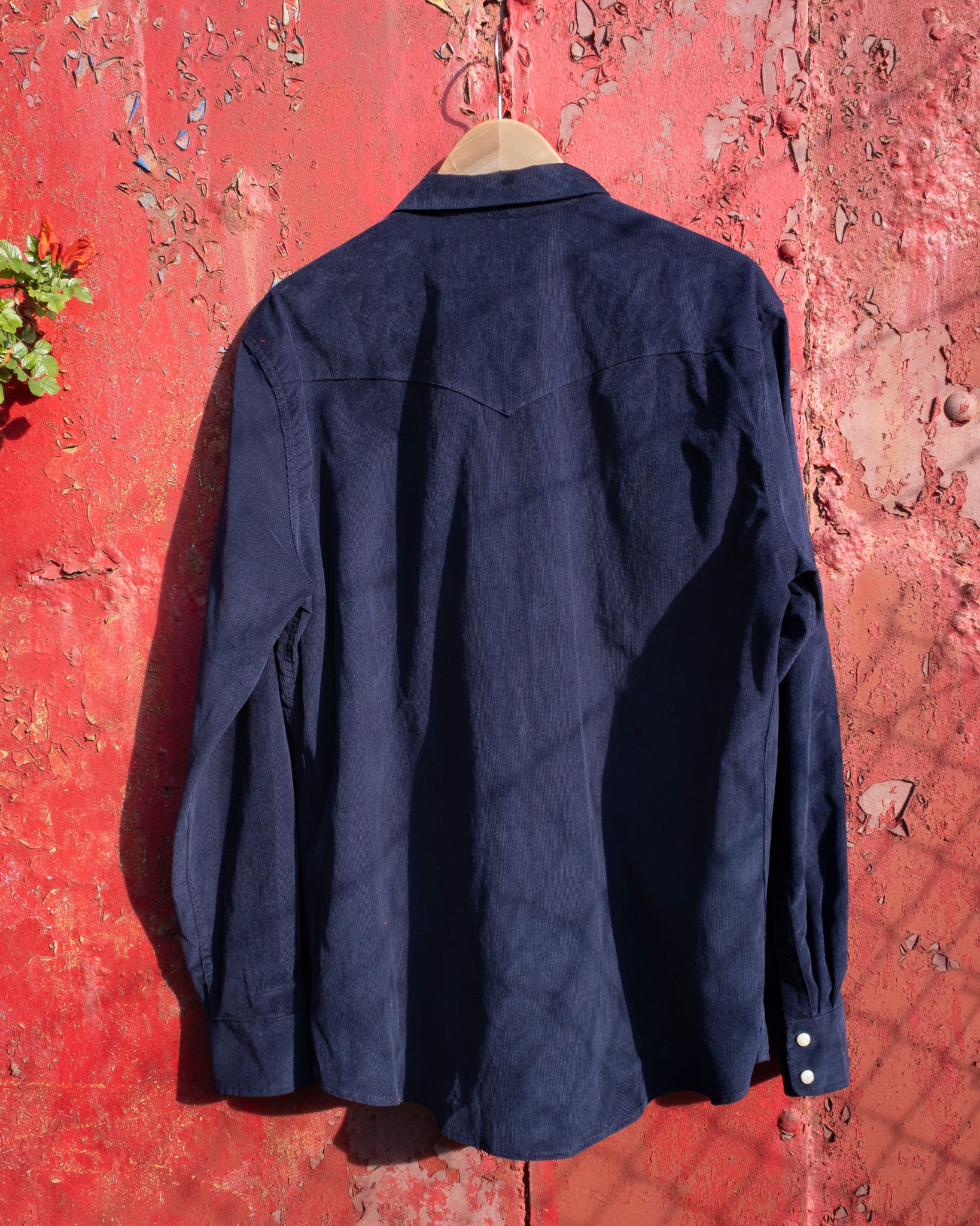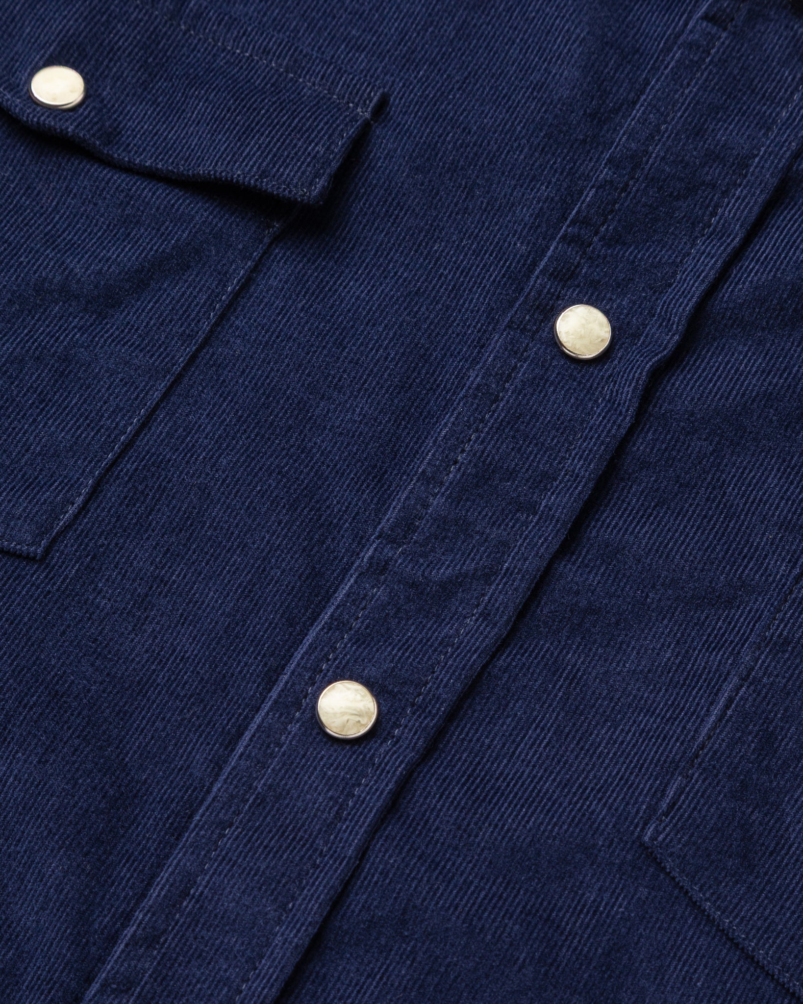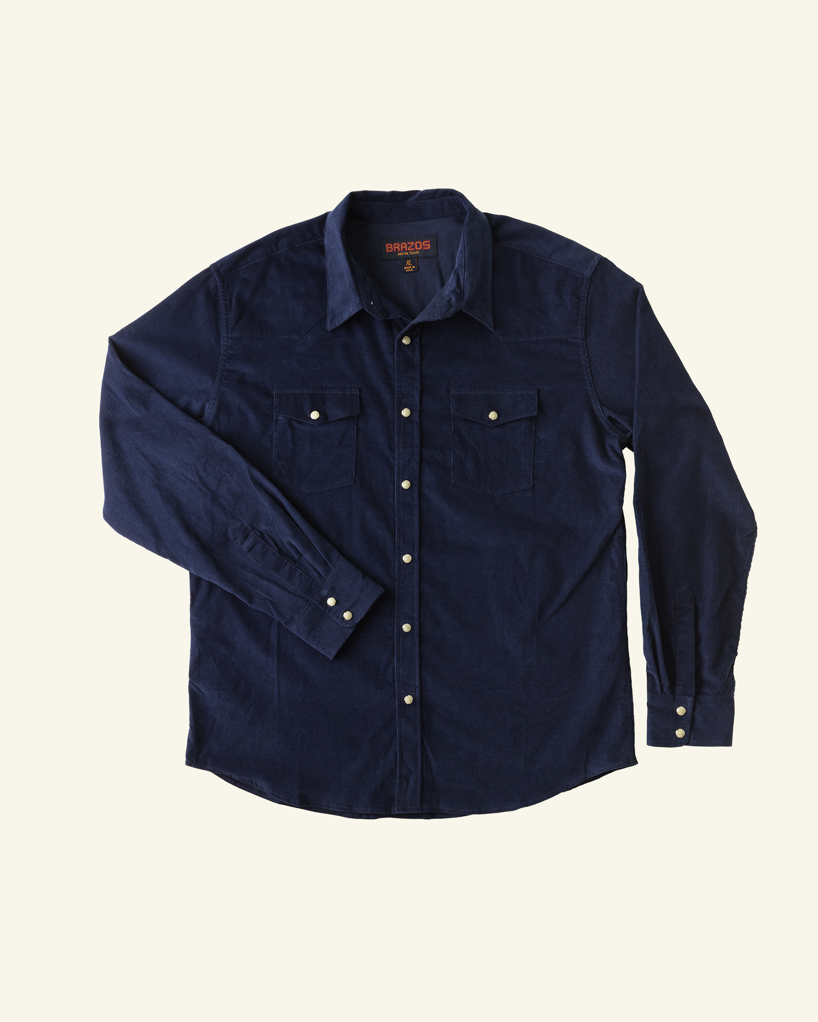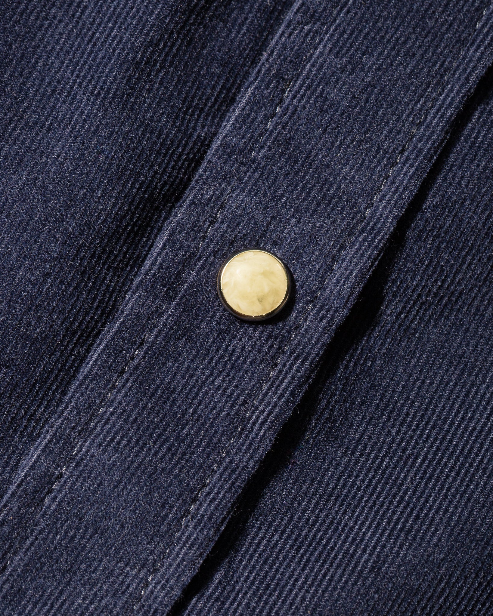 A fine whale micro corduroy in navy blue.  This supple cotton garment is both luxurious and practical. Incredibly soft to the touch, and a delight to wear.  The prewashed, preshrunk corduroy is custom sourced by Brazos from one of the finest textile mills in all the orient.  The snaps are off-white horn color, and pair exquisitely with the blue corduroy.  Buy it. Wear it. We'll be damned if it doesn't become a fast favorite you reach for often.