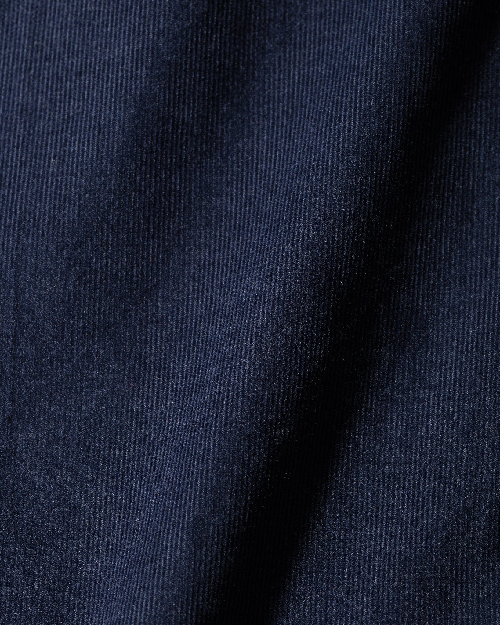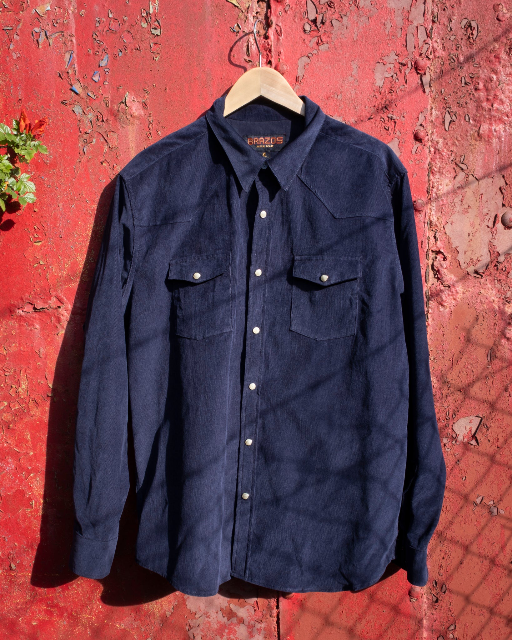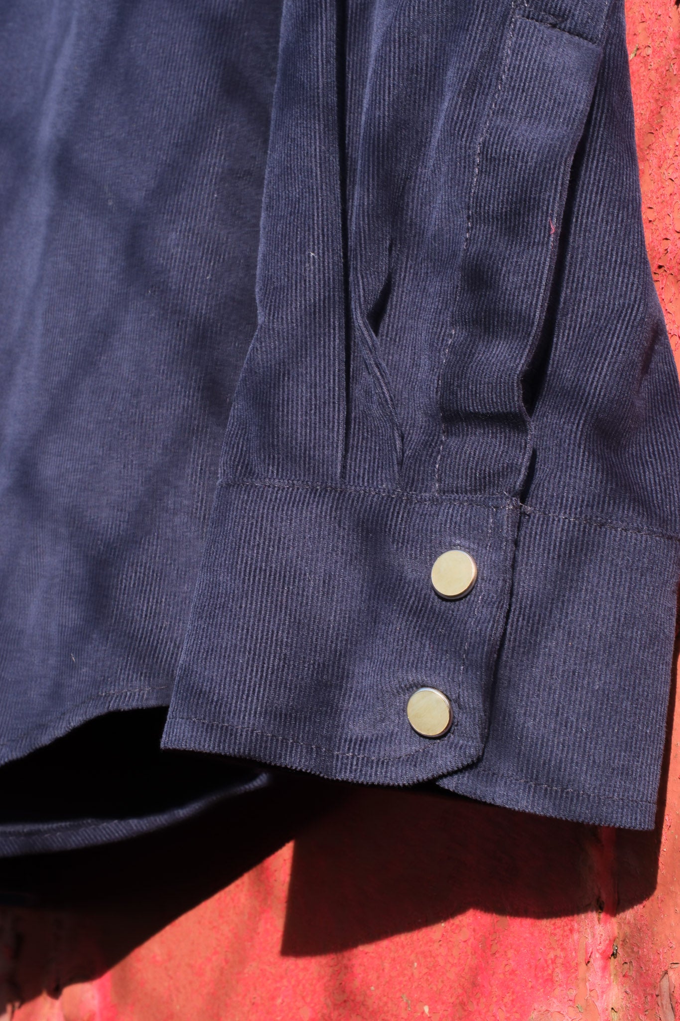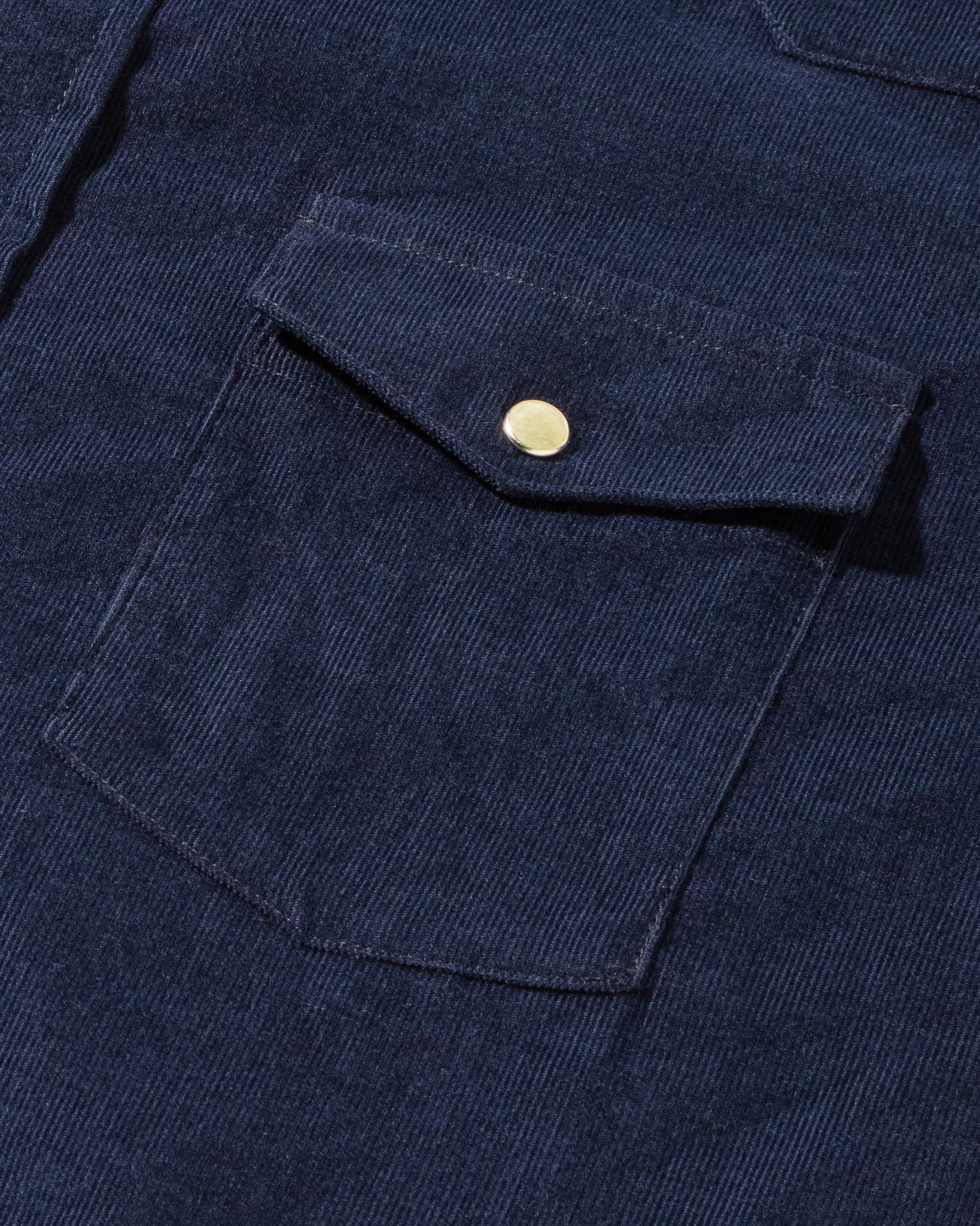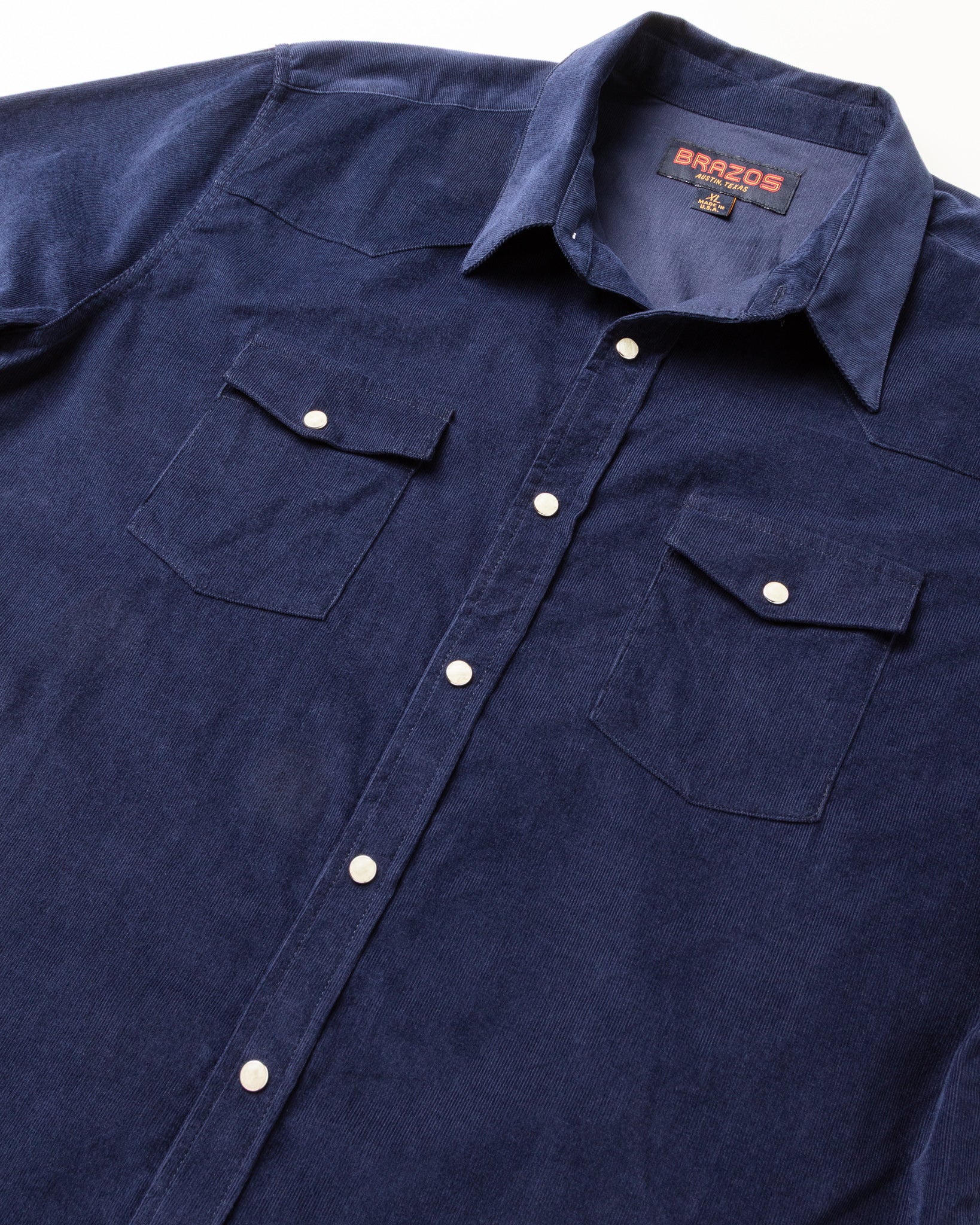 A fine whale micro corduroy in navy blue.  This supple cotton garment is both luxurious and practical. Incredibly soft to the touch, and a delight to wear.  The prewashed, preshrunk corduroy is custom sourced by Brazos from one of the finest textile mills in all the orient.  The snaps are off-white horn color, and pair exquisitely with the blue corduroy.  Buy it. Wear it. We'll be damned if it doesn't become a fast favorite you reach for often.